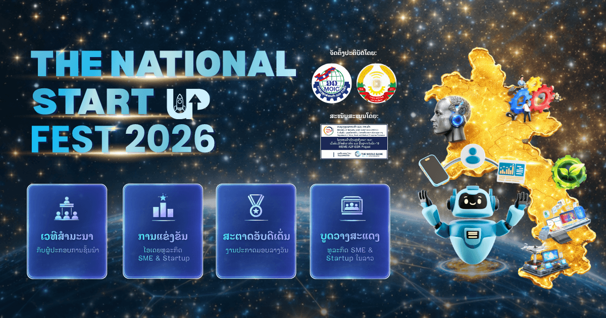 The National Startup Fest 2026 - ງານມະຫະກຳສະຕາດອັບແຫ່ງຊາດ 2026 ພະຫັດ, 23 ເມສາ 2026 - ສຸກ, 24 ເມສາ 2026 ພະຫັດ, 08:30 - 16:30 | ສຸກ, 08:30 - 16:30 ໂຮງແຮມ Holiday Inn & Suites Vientiane ຊື້ບັດເຂົ້າງານ