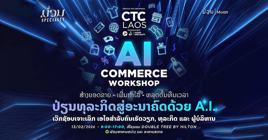 CTC Laos - AI Commerce Workshop ສຸກ, 13 ກຸມພາ 2026 09:00 - 17:00 ໂຮງແຮມ Double Tree by Hilton ຊື້ບັດເຂົ້າງານ